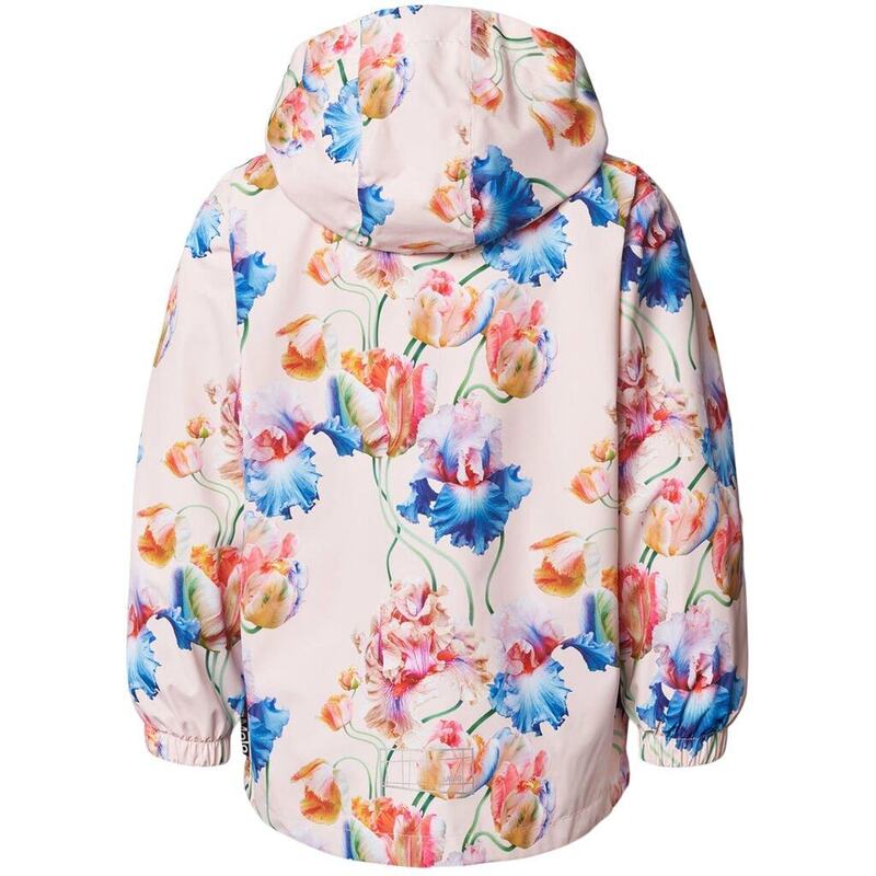 Imearmas roosa tuule- ja veekindel vihmajope taaskasutatud polüestrist, eemaldatava kapuutsiga ja kaunite kunstiliste lillede trükiga. Jopel on tavaline lõige, küljetaskud, elastsed kätised ja alläär, veekindlad õmblused ning lõuakaitsme ja tormiklapiga lukk ilmastiku eest kaitsmiseks. Sees võrkvooder.